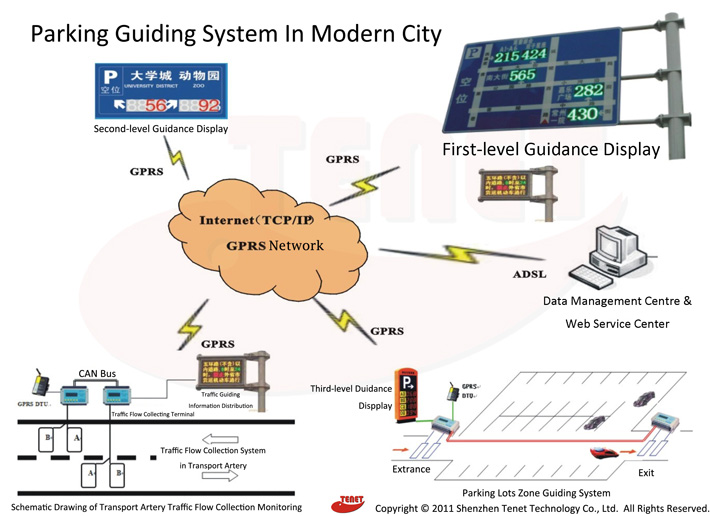 1. Parking available space collection system: includeparking space guidance system, parking zone guidance system, parking charge fees& management system, as well as other traffic light control system.