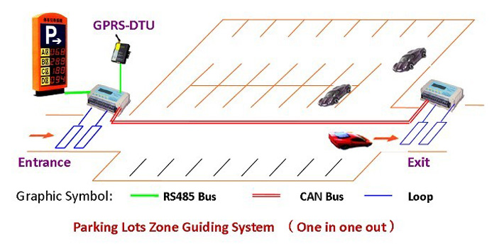 The system is a CAN bus local area network controlsystem consisting of two or more zone guidance controller (PGS-310) and emptyparking space display module. Installing one zone guidance controller at theentrance of each single traffic lane, there are N pcs zone guidance controllerat the N entrance. Each controller set up a turn one address from 1 to N. The No.1is host controller, and the rest are the extension set. Hostcontroller is responsible for system data processing, then transmit theprocessed space information to every extensions set through the CAN bus; and thenwith extension set, transmit the related information to related parking spacesguidance display through the RS485 port.